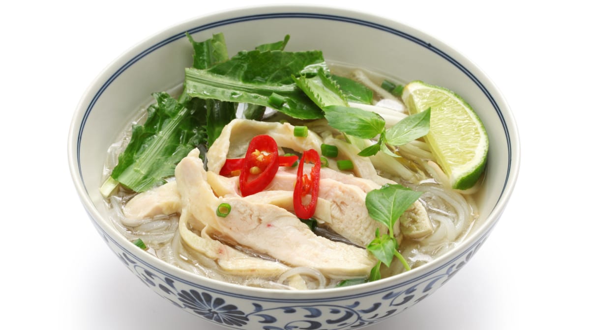 - 用大锅加热鸡汤。放入鸡肉、姜和大蒜,慢火炖 15 分钟直至鸡肉煮熟。